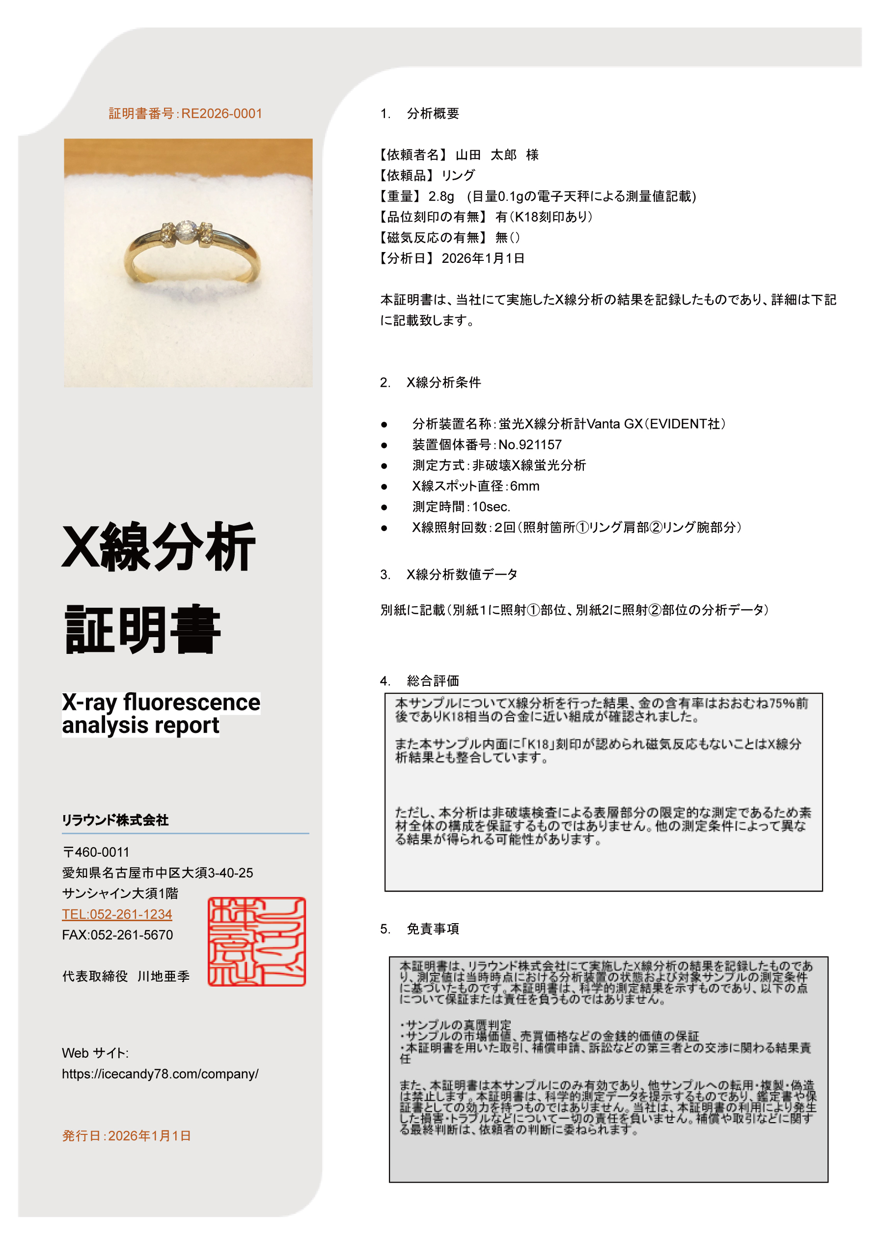 本証明書は、リラウンド株式会社にて実施したX線分析の結果を記録したものであり、測定値は当時時点における分析装置の状態および対象サンプルの測定条件に基いたものです。