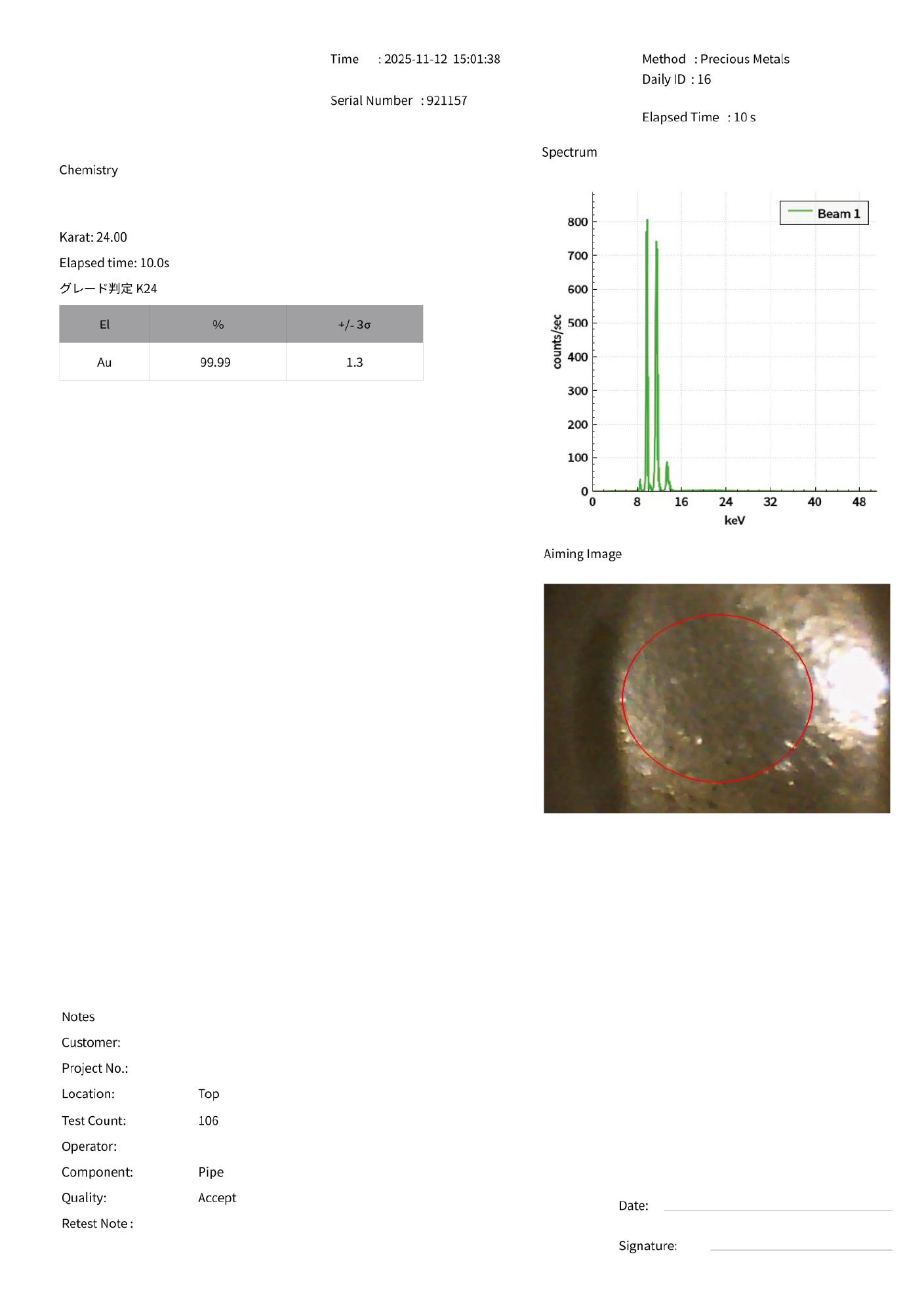成分分析の結果を客観的に示すのみで、査定価格や取引条件については保証いたしかねます。